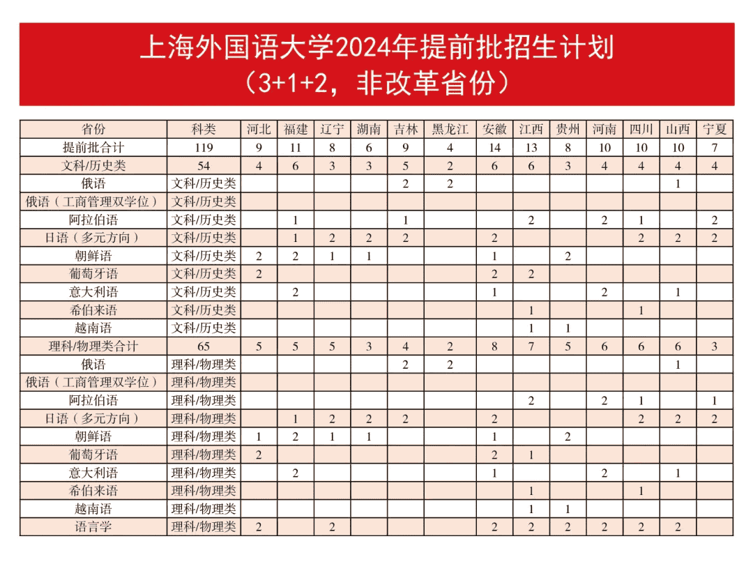 本文为大家整理的是上海外国语大学2024年招生计划,主要包含招生专业、招生类别、各专业招生人数等信息,希望对大家有所帮助,如有变动或异议,请以各省市教育考试院或学校公布的信息为准。