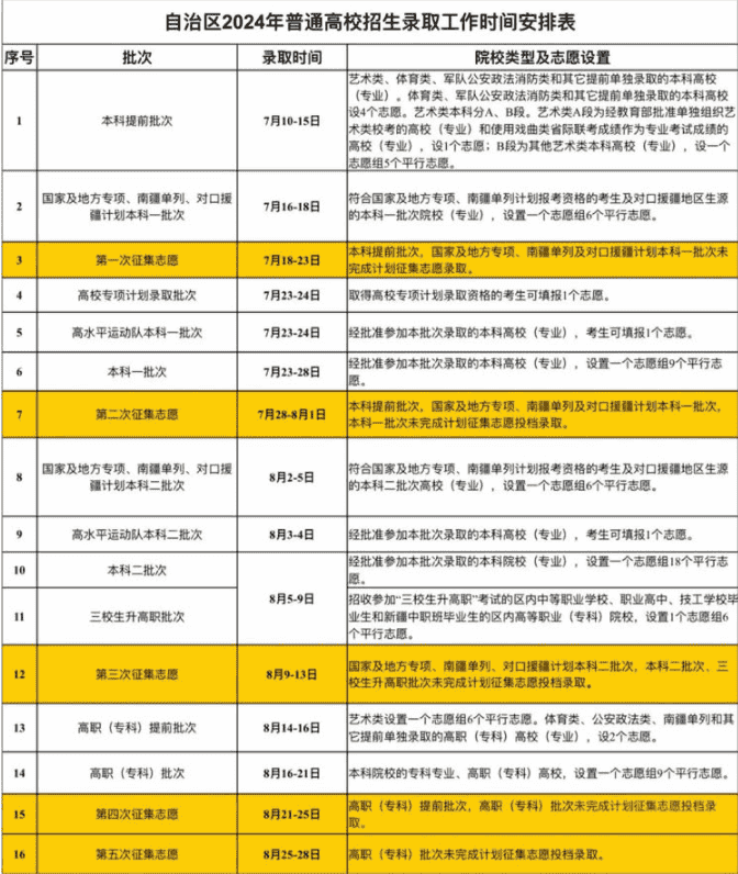 新疆自治区2024年普通高校招生录取工作将于7月10日正式开始,预计8月28日结束,详见《自治区2024年普通高校招生录取工作时间安排表》。录取分本科提前批次,国家及地方专项、南疆单列、对口援疆计划本科一批次,高校专项计划批次,高水平运动队本科一批次,本科一批次,国家及地方专项、南疆单列、对口援疆计划本科二批次,高水平运动队本科二批次,本科二批次,高职(专科)提前批次,高职(专科)批次共10个批次进行。“三校生升高职”批次录取预计8月5日开始,8月13日结束。