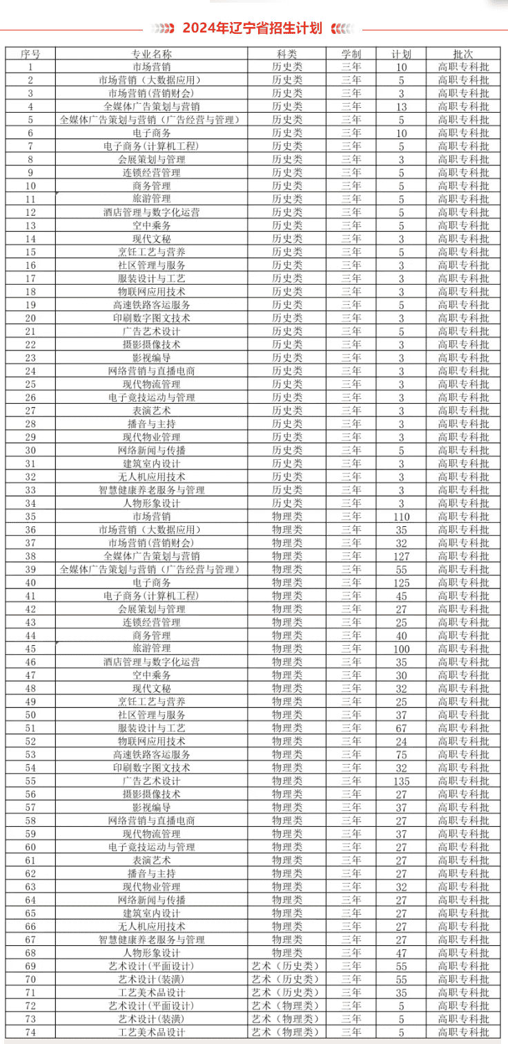 本文为大家整理的是辽宁广告职业学院2024年招生计划,主要包含招生专业、招生类别、各专业招生人数等信息,希望对大家有所帮助,如有变动或异议,请以各省市教育考试院或学校公布的信息为准。