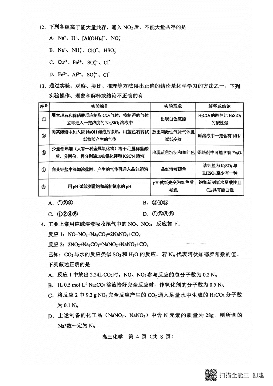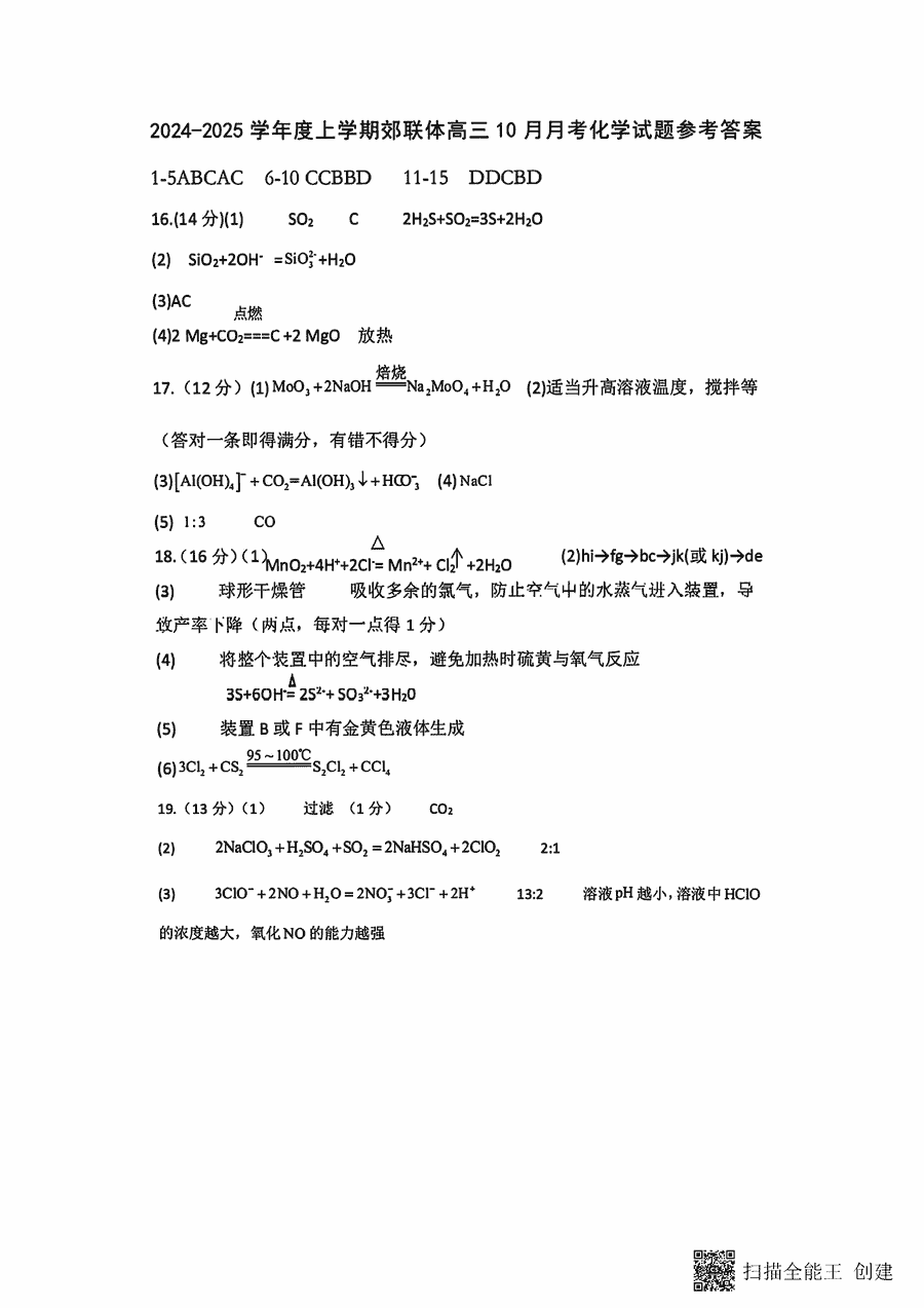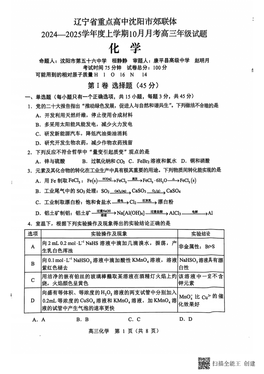 辽宁重点高中沈阳市郊联体2025届高三10月月考化学试题及答案