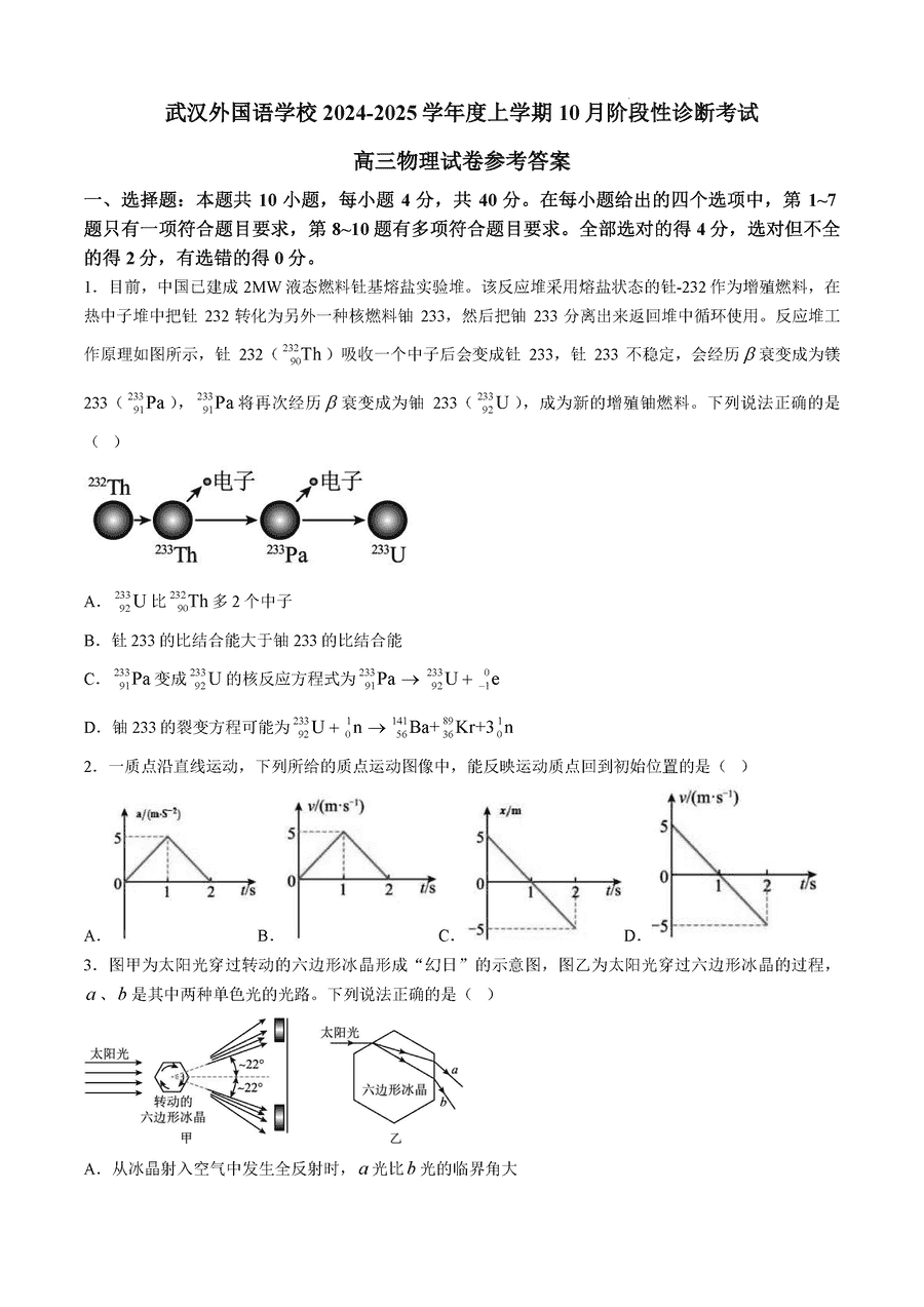武汉外国语学校2025届高三上学期10月月考物理试题及答案