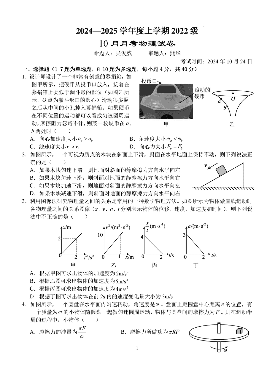 荆州沙市中学2025届高三上学期10月月考物理试题及答案
