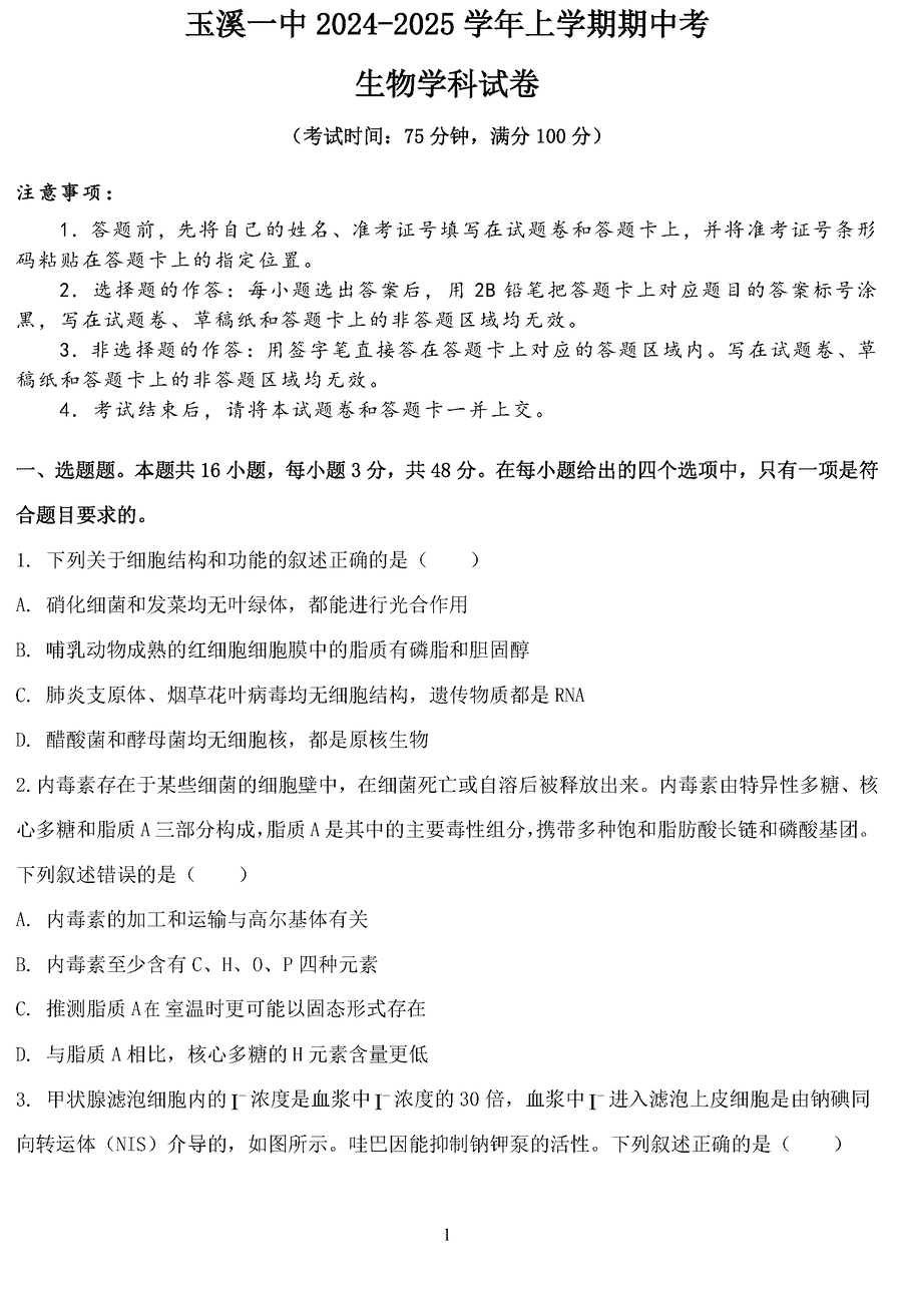 玉溪一中2024-2025学年高三上学期期中生物试题及答案