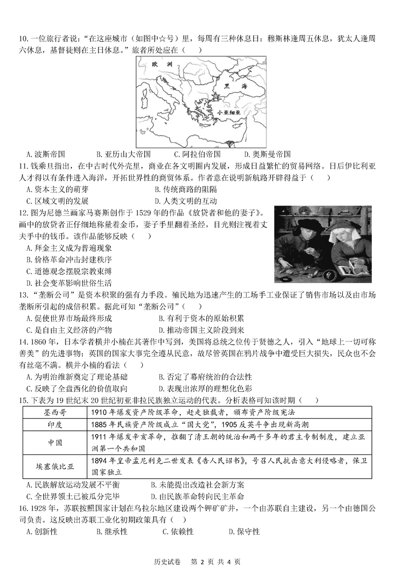 四川省名校联盟2025届高三12月联考历史试题及答案 时间:2024-12-18 11:22 四川 文综试题 四川省名校联盟2025届高三12月联考历史考试已于近日开考,为方便考生考后及时查看考试情况,查漏补缺、弥补不足,本文整理了试题答案解析相关信息! 汇总:四川省名校联盟2025届高三12月联考试题及答案汇总 历史试题及答案解析