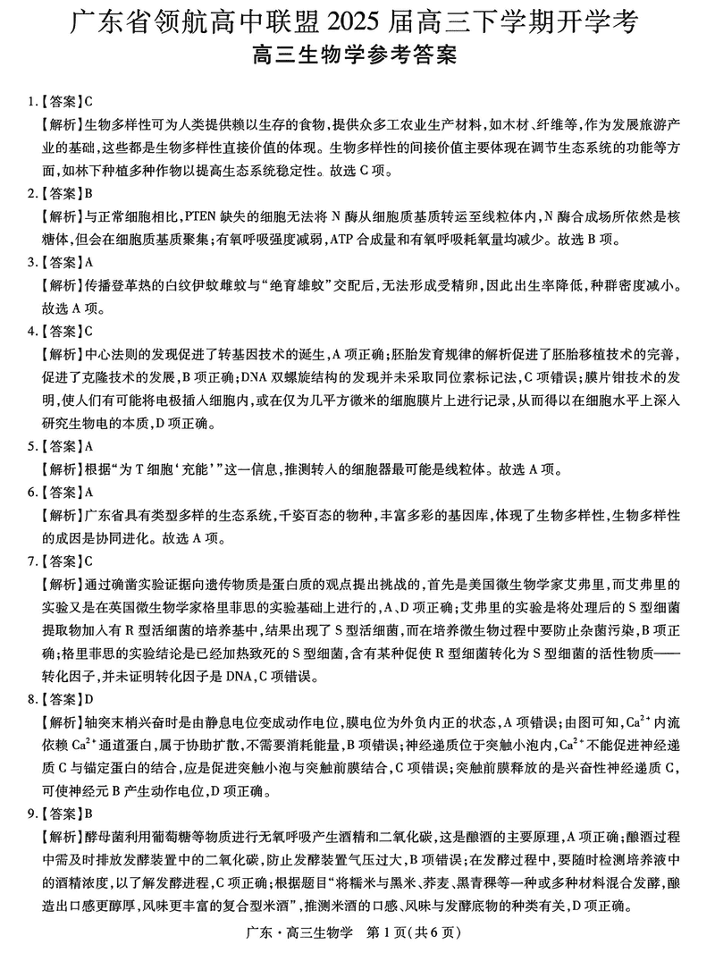 广东省领航高中联盟2025届高三下学期2月开学考生物试题及答案