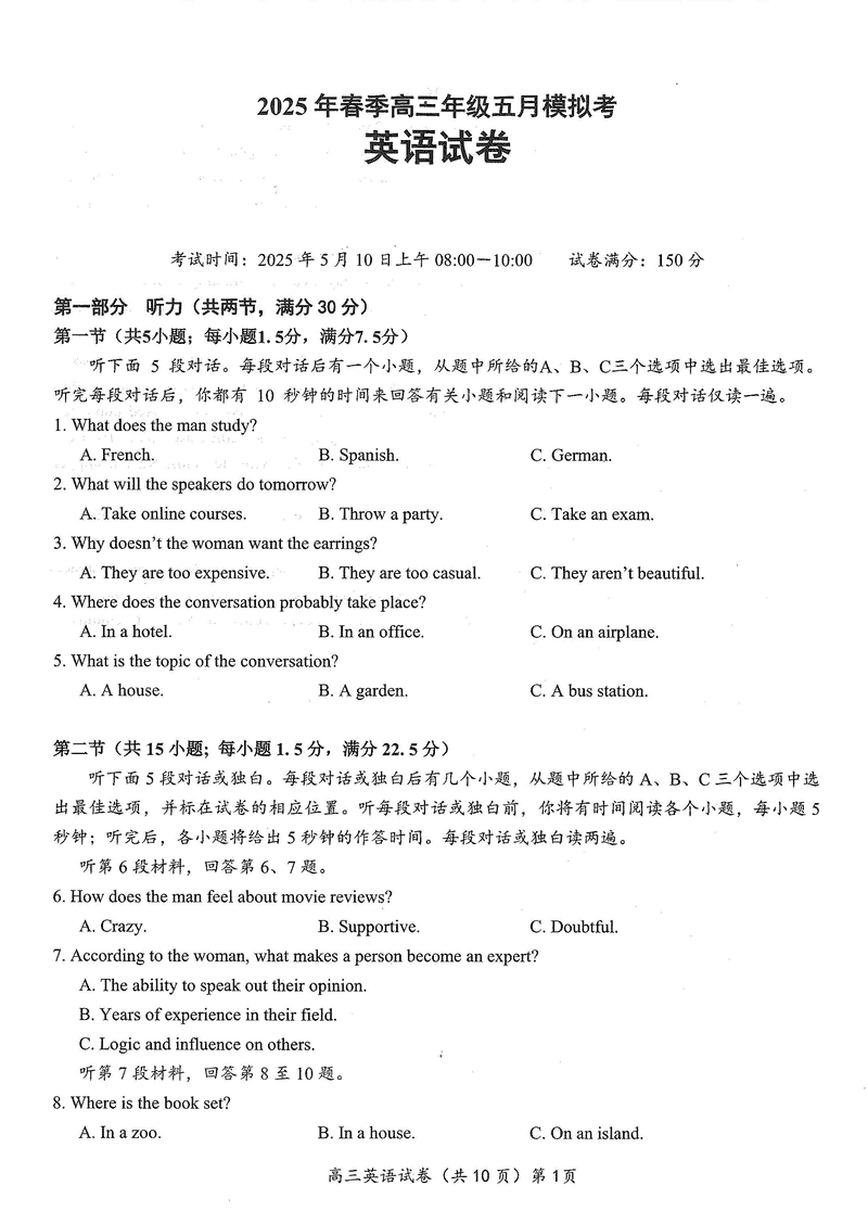 湖北鄂东南2025年春季高三五月模拟考英语试题及答案