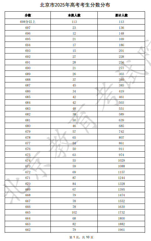 北京2025高考成绩一分一段表(完整版)