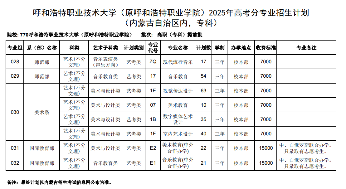 呼和浩特职业技术大学艺术类招生计划