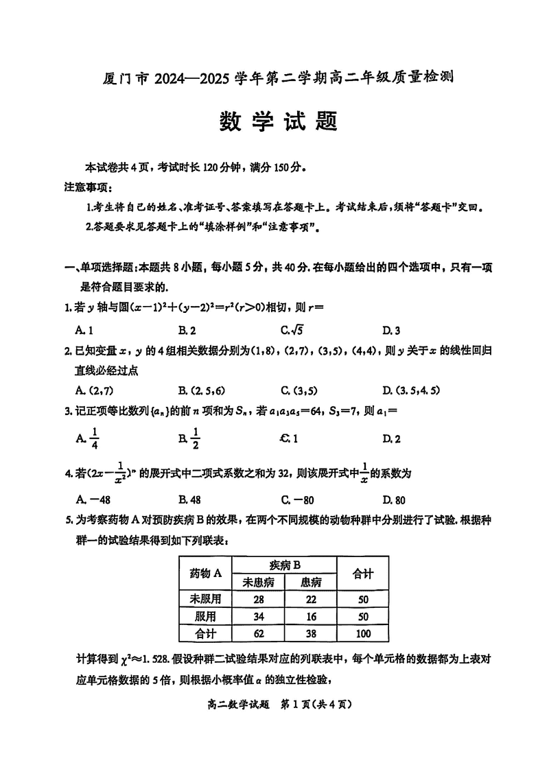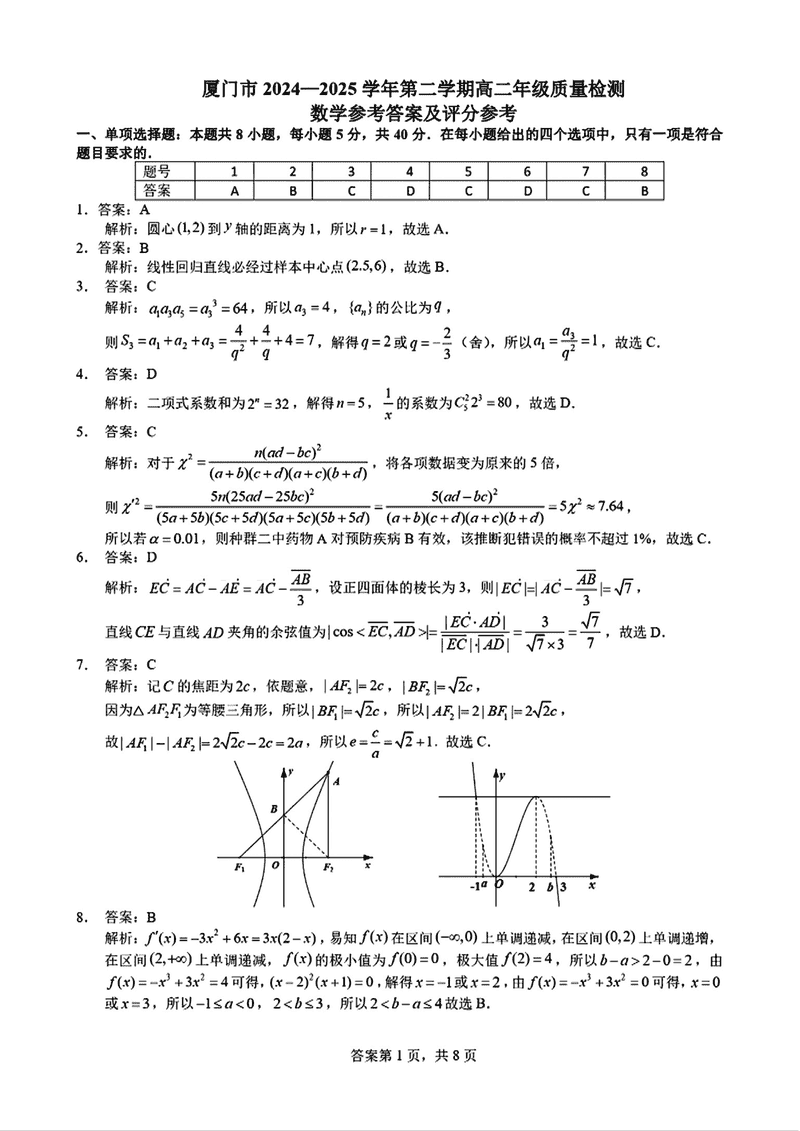 福建省厦门市2024-2025学年高二下学期期末质量检测数学考试已于近日开考,为方便考生考后及时查看考试情况,查漏补缺、弥补不足,本文整理了试题答案解析相关信息!