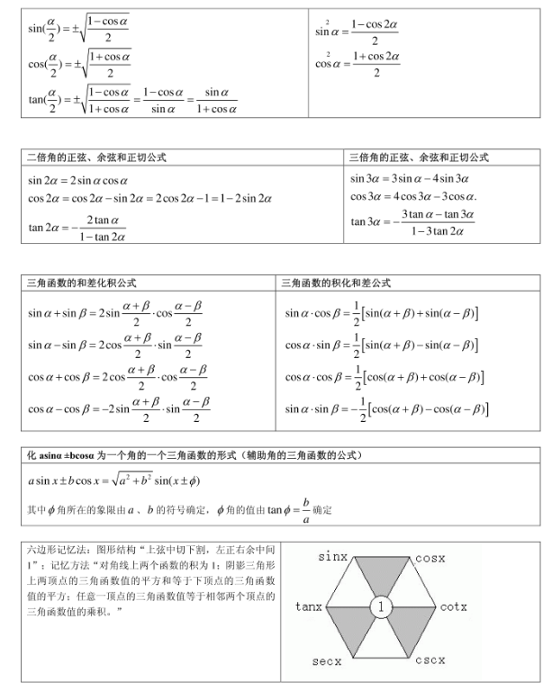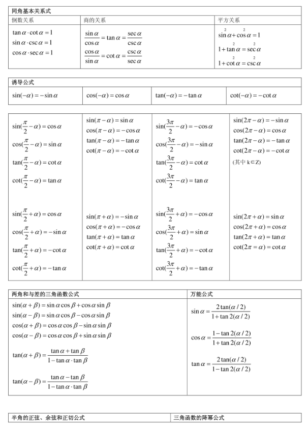 三角函数公式大全表格汇总