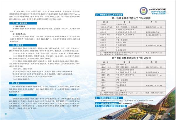 锦州师范高等专科学校发布了2020年单招章程,公布了考试时间等内容,考试时间,第一阶段:6月21日(8:00~16:30);第二阶段:9月25日(8:00~16:30)。