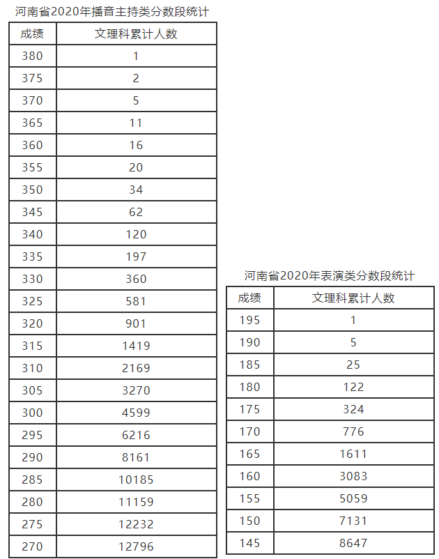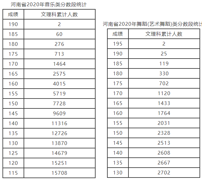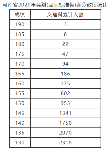 河南2020年艺术类分数段统计表(播音主持,表演,音乐,舞蹈含艺术舞蹈、国际标准舞)公布,具体一分一段表情况如下: