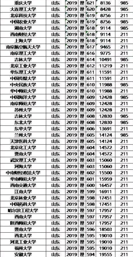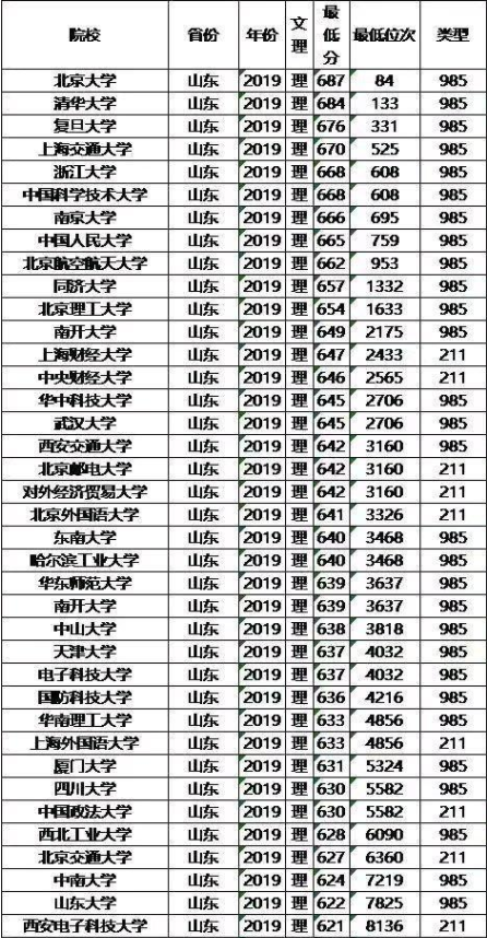 2019年山东985/211大学录取分数线及位次排名汇总(理科)