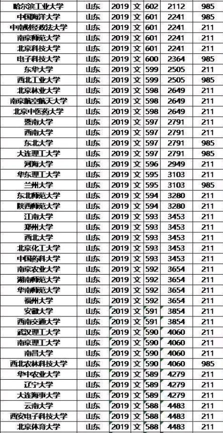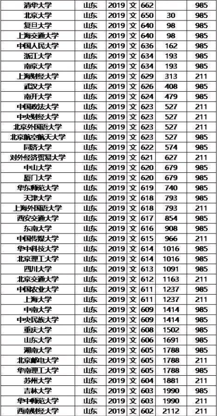 2019年山东985/211大学录取分数线及位次排名汇总(文科)