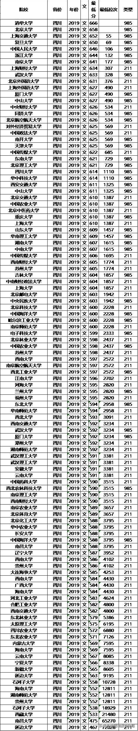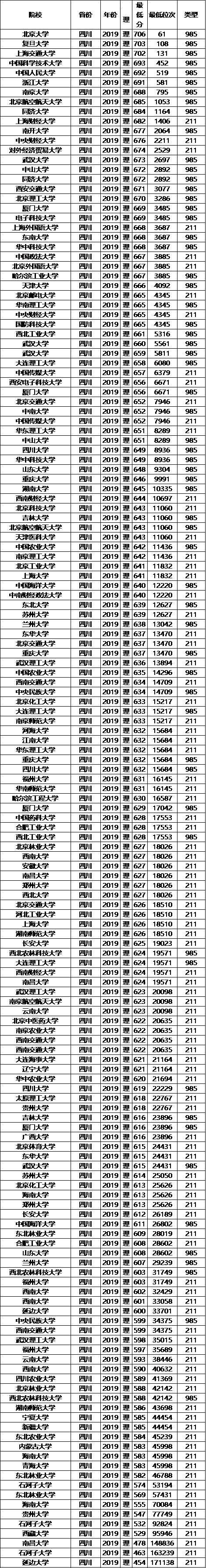 211大学2019年四川录取分数线及位次排名