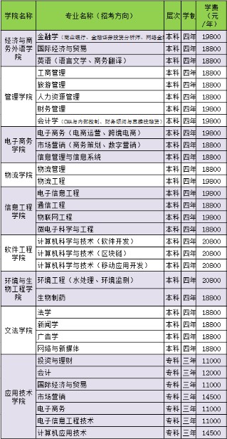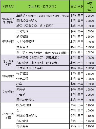 武汉工商学院各专业学费收费标准