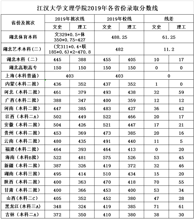 2019年湖北省本科(二)录取分数线:文科455分,理科405分;湖北省专科录取分数线:文科150分,理科150分;湖北省体育本科录取分数线488.25分;湖北省艺术本科(二)录取分数线:482分