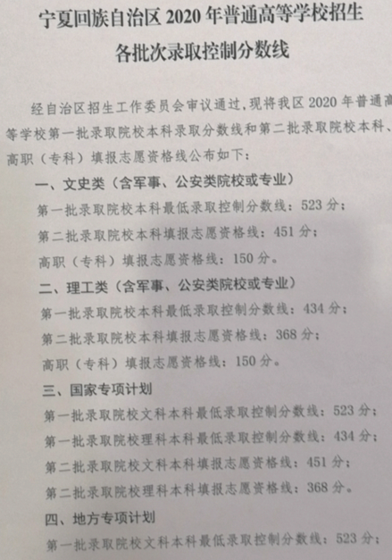 2020宁夏高考地方专项计划分数线公布