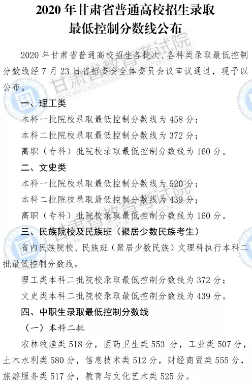 2020年甘肃高考录取分数线已经公布,想必同学们都已经迫不及待的想要知道今年甘肃的分数线是多少,以下就是小编整理的甘肃录取分数线,来看看吧。