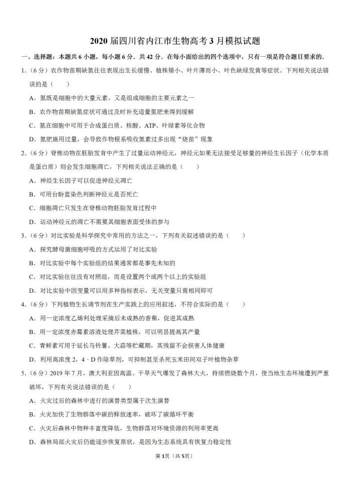 选择题:本题共6小题,每小题6分。共42分。在每小面给出的四个选项中,只有一项是符合题目要求的。> ...