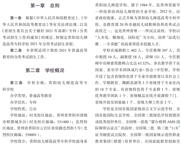 贵阳幼儿师范高等专科学校2021分类考试招生章程