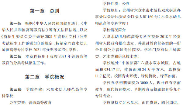 六盘水幼儿师范高等专科学校2021分类考试招生章程