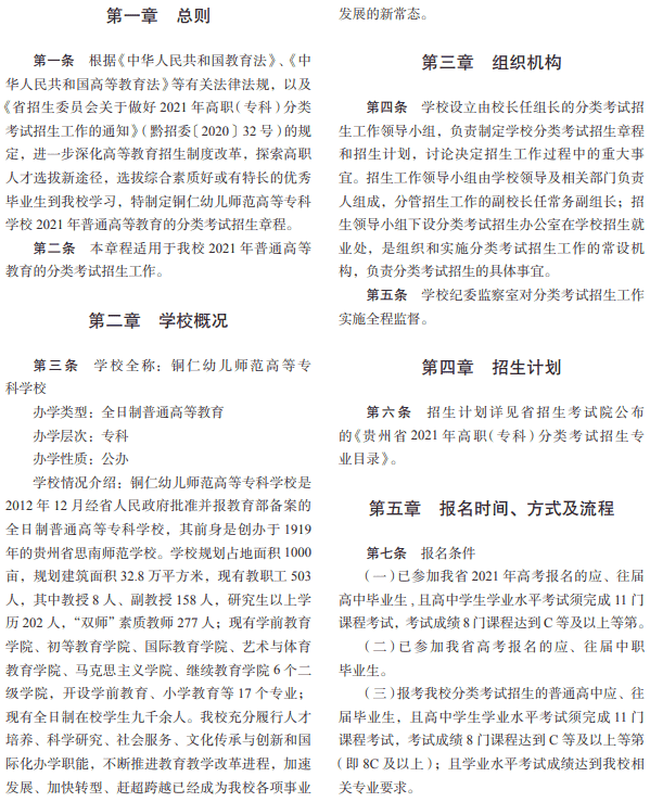 铜仁幼儿师范高等专科学校2021分类考试招生章程