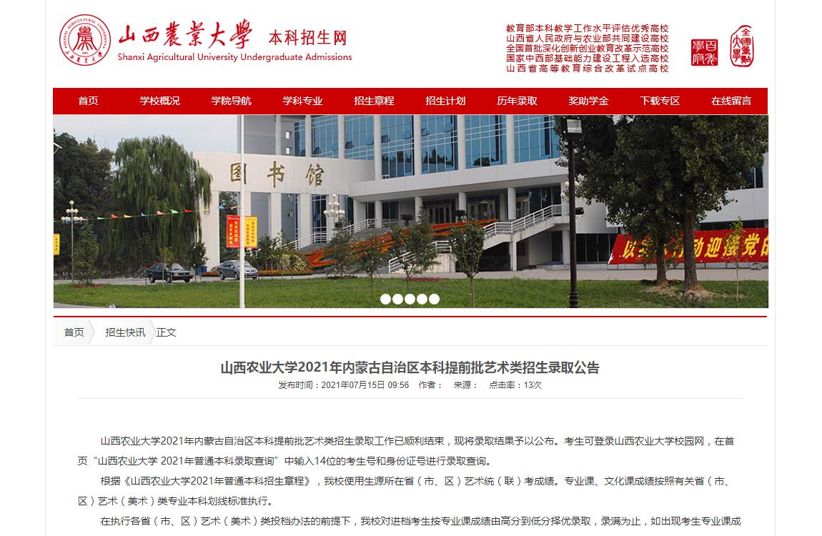 山西农业大学2021年内蒙古自治区本科提前批艺术类招生录取公告