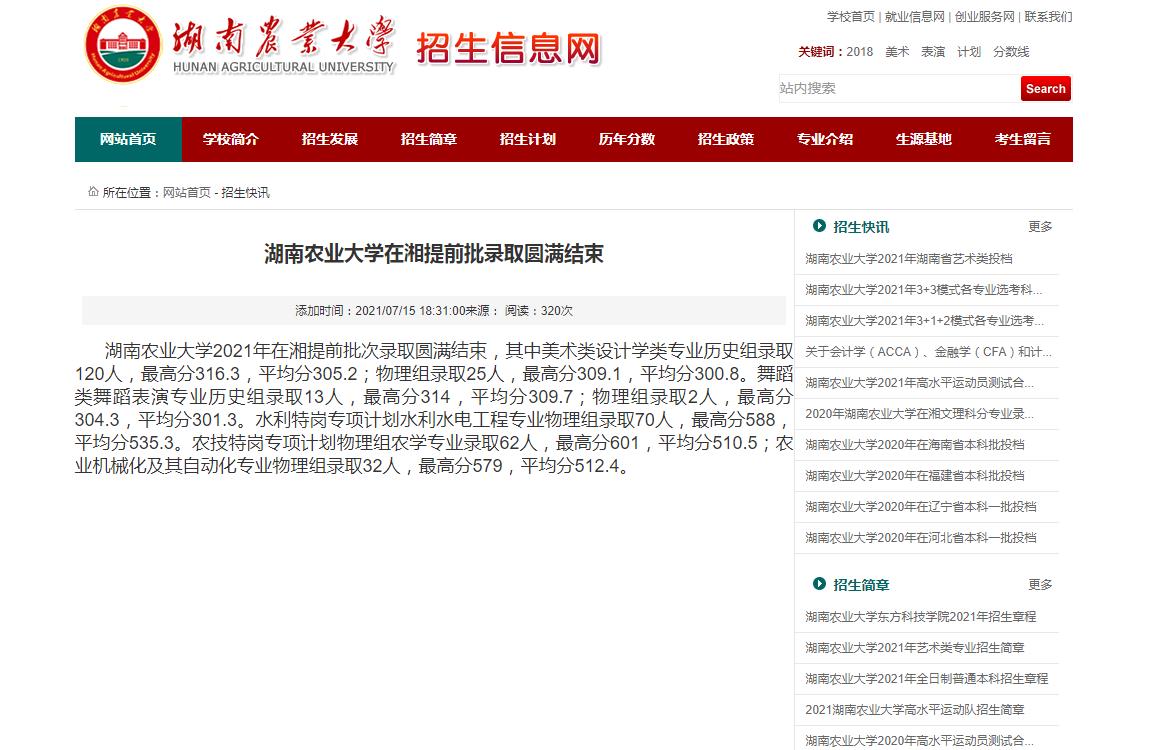 关于湖南农业大学于2021-07-17 11:10:42发布的湖南农业大学2021年在湘提前批录取分数情况的信息由五米高...