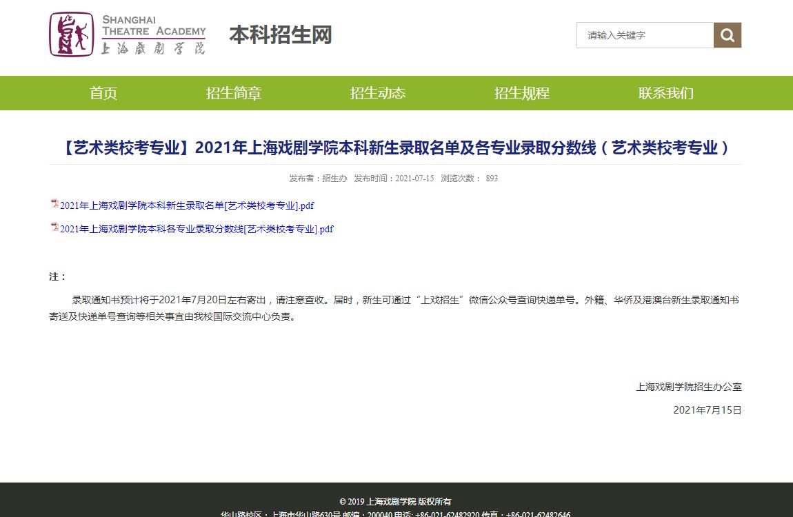 关于上海戏剧学院于2021-07-17 11:15:11发布的2021年上海戏剧学院本科新生录取名单及各专业录取分数线(...