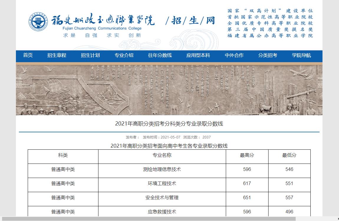 福建船政交通职业学院2021年高职分类招考分科类分专业录取分数线