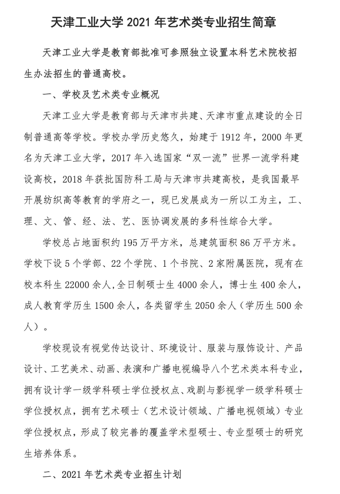 天津工业大学2021年艺术类专业招生简章