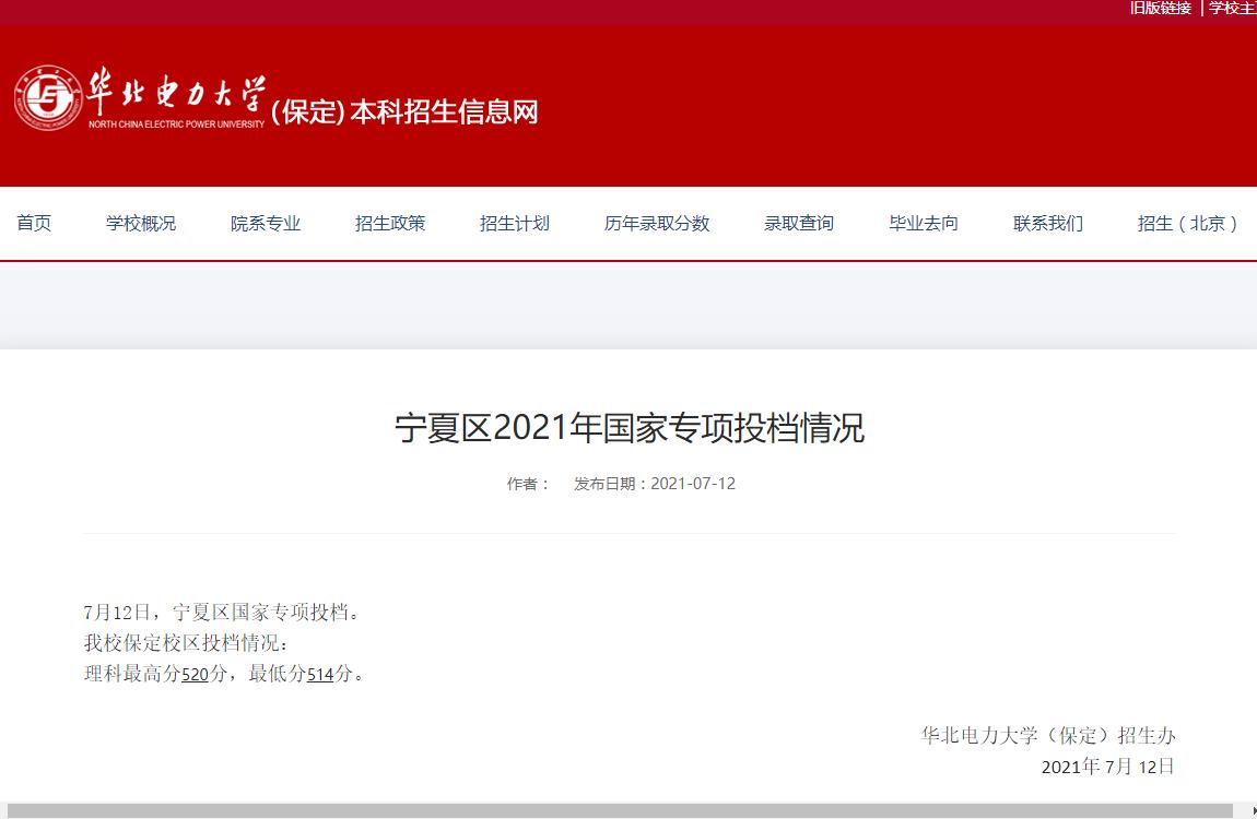 7月12日,宁夏区国家专项投档。我校保定校区投档情况:理科最高分520分,最低分514分。华北电力大学(保定)招生办20...